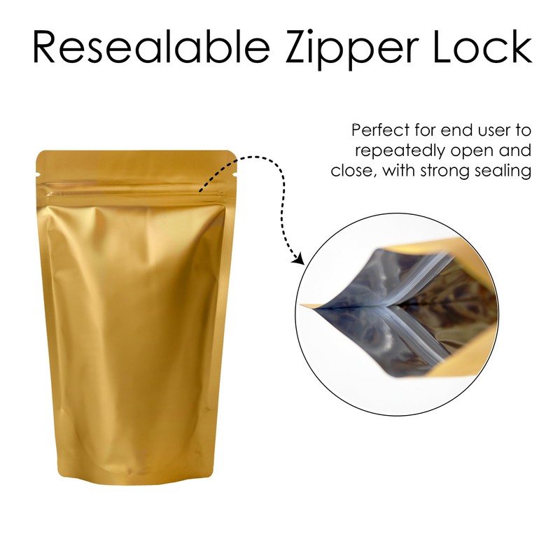 - ZIPPER OR RESEALABLE: Our stand-up pouches come with a built-in zipper or resealable closure feature. This allows end consumers to easily open and close the pouch, preserving the freshness of the contents and providing convenience for repeated use.