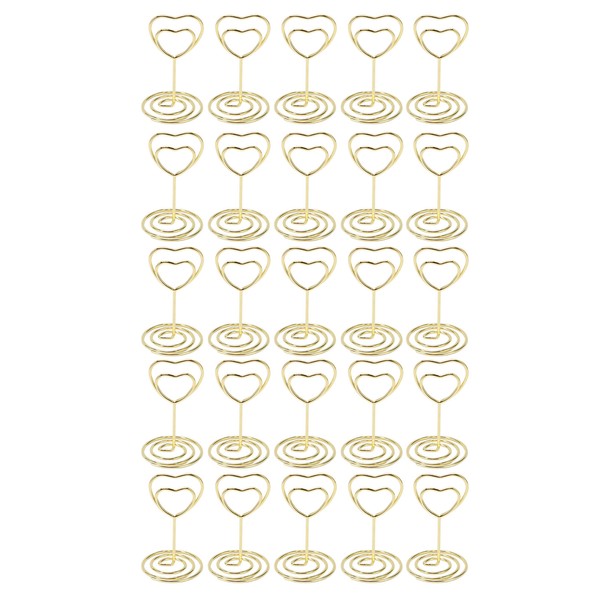 1、Heart Shape: These table number stands feature heart shaped style with bright gold color, which is very exquisite and eye catching. 2、25 Pieces: 25 pieces of name card holders are packed together, display your table number cards, food signs, memo notes, recipe cards and more. 3、Wide Application: With these place card holders, your guests to get impressed by your décor for weddings, parties or any other occasion. 4、Sturdy Metal: These table number holders adopt premium metal material, which is highly durable and resistant to rust and corrosion. 5、Stable Base: These table number holders possess strong clamping force and stable base, they won't fall over to ruin your elegant presentation.