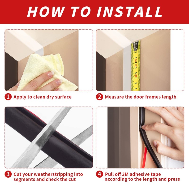 - 【EASY INSTALLATION】Super strong self-adhesive door/window weather stripping is covered on one side with a strong sticky substance. Install it just by tearing the red film on the surface. After being pasted for 24 hours, the sealing strip is very firm and will not fall off (no longer affected by extreme temperatures).