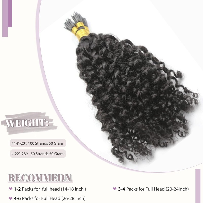 26 Inches I Tip Human Hair Extensions 100 Strands/Pack 50g Pre Bonded Keratin Stick Tipped Hair Bundles Cold Fusion Long Natural Black Curly Water Wave I Tip for Women Hair Extensions