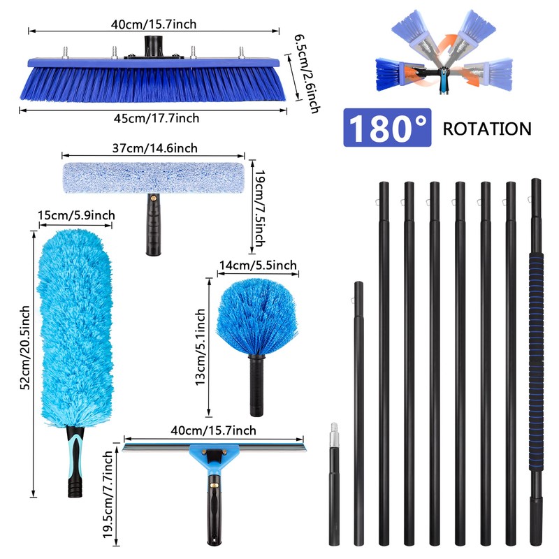 - Water Fed Pole Kit - Our cleaning kit includes all the essential tools, such as 40cm water brush, window scrubber, adjustable angle squeegee, cobweb duster, feather duster. Replacing different types of duster brush heads can handle different cleaning scenarios.