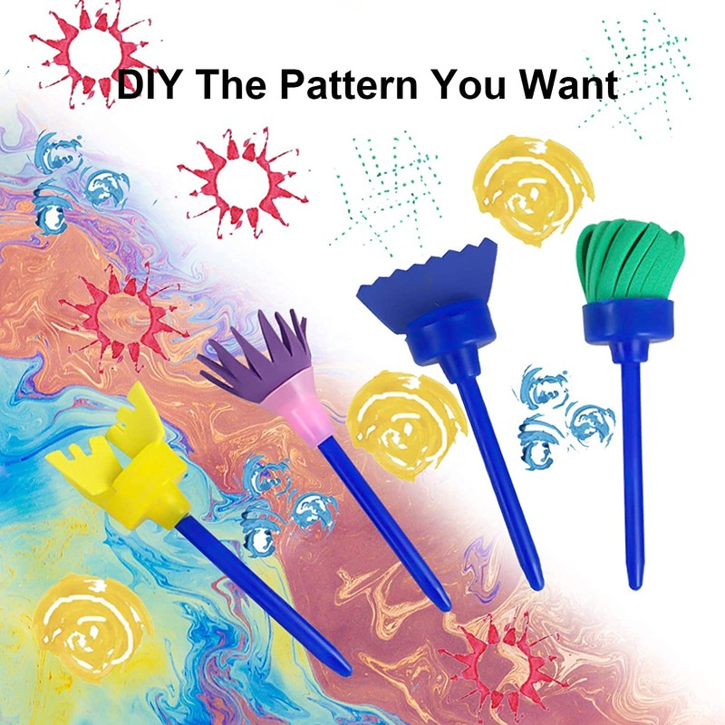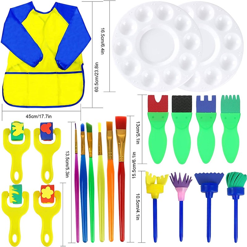 - 🎨Rich Sponge Brush Set:You will get 26pcs sponge drawing brushes kits for kids.Come with 2 waterproof apron,6 paint brushes,4 Stamp flower painting brushes,4 shovel brushes,4 sponge roller brushes(random color),4 paint pots with colorful lids,and 2 Plastic Palettes.