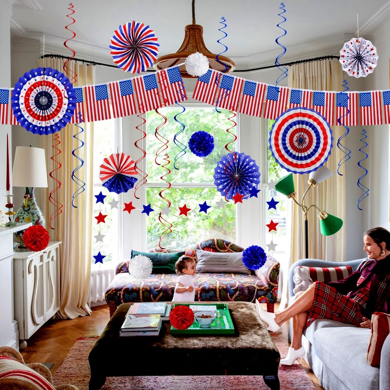 - Patriotic Party Decorations Includes: 6 foldable hanging paper fans, 6 colorful paper pom poms(2white + 2red + 2navy blue), 12 hanging swirls(6red + 6blue), 1 American patriotic banner Love USA flag and 1 string of star streamer.