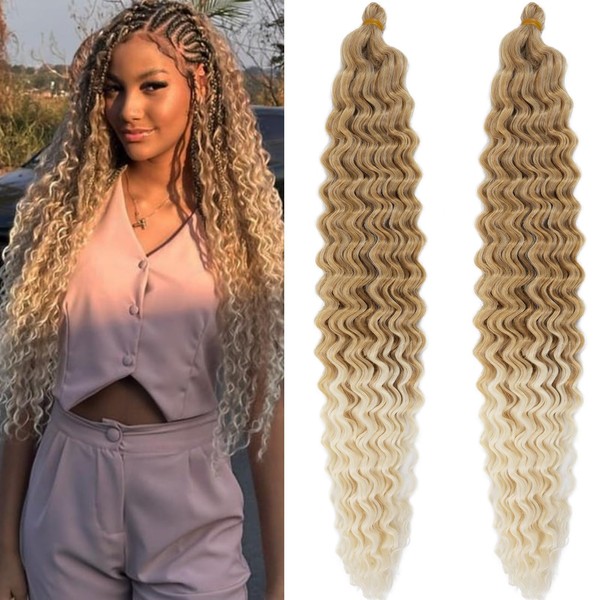 27/613 Deep Water Wave Crochet Hair Ocean Wave Boho Curly Wavy Braiding Hair Pre Stretched 24 Inch 2 Packs 27/613 Boho Curls Hair for Braiding Synthetic Bohemian Crochet Braids