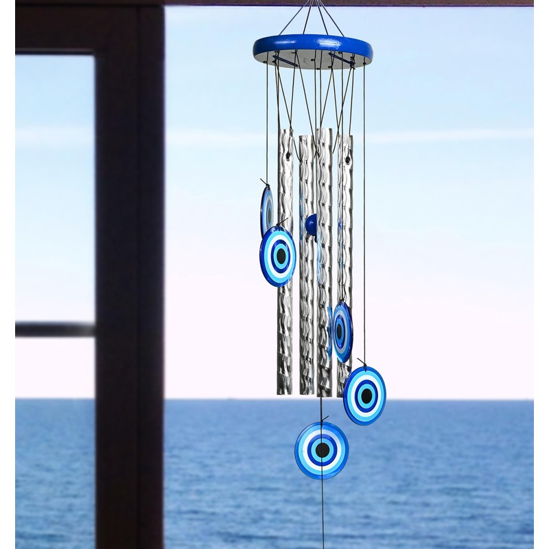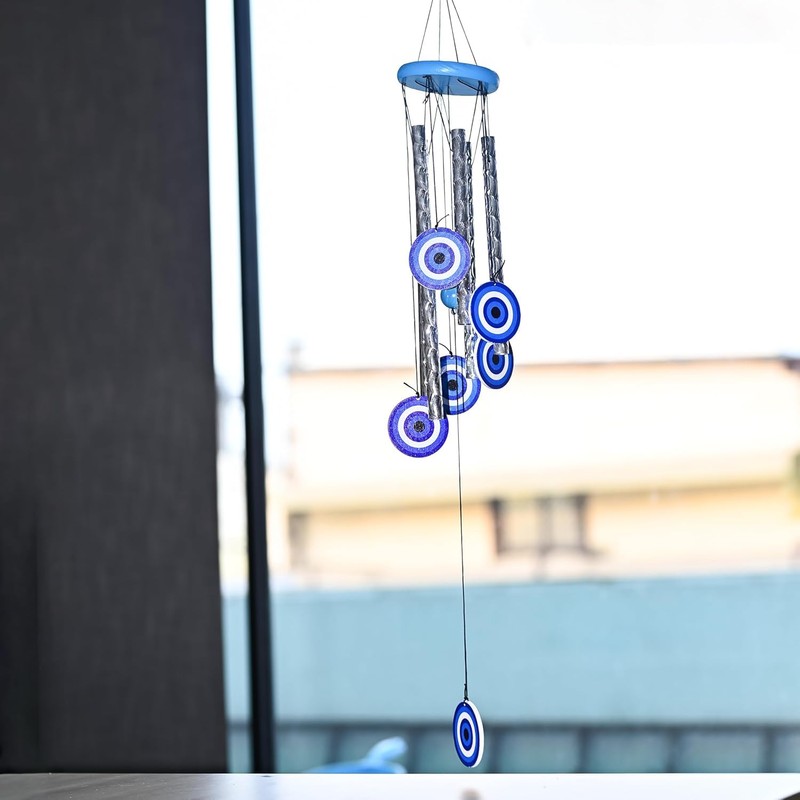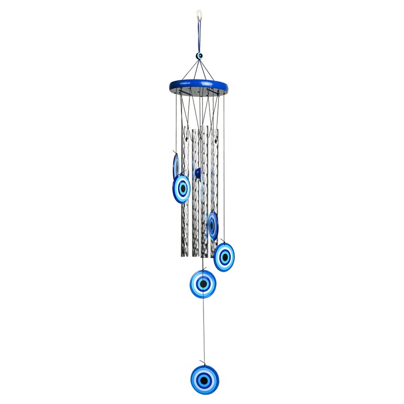 - Evil Eye Wind Chimes: Enhance your space with these elegant wind chimes featuring Evil Eye charms and 4 silver pipes. Combining modern and traditional design, they produce soft, soothing tones in the breeze, creating a serene atmosphere while adding a touch of charm to any setting.