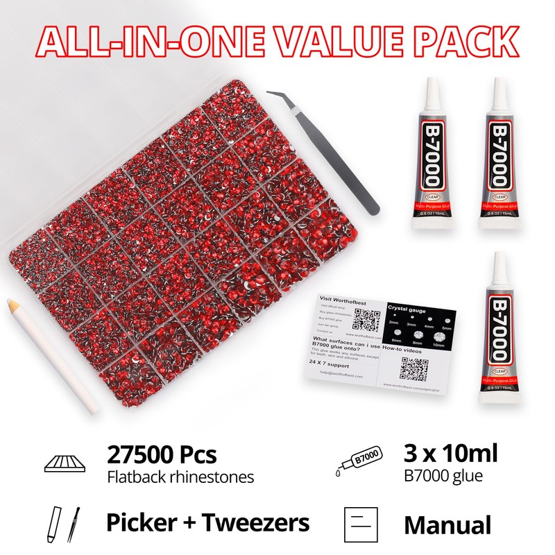 27500Pcs Red Resin Rhinestones for Bedazzling Crafting, 2-6mm Mixed Sizes Flatback Bulk Crystal Kit with B7000 Glue for Book Clothes Crafts Shoes Clothing Fabric DIY Manualidades Tumbler