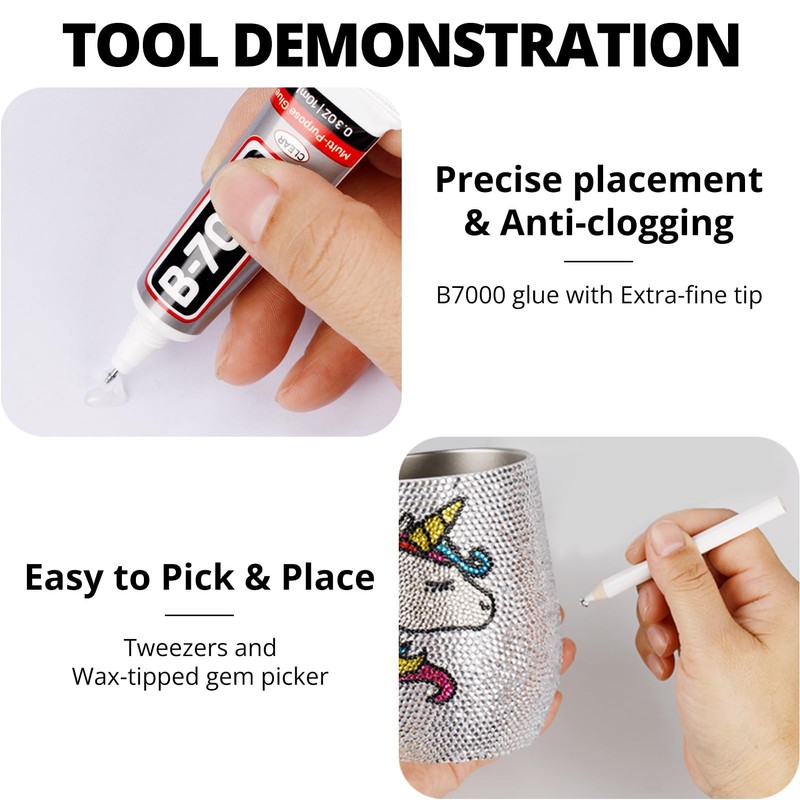 - Super Easy to Use - Pick your fave item, Paste some glue, pick up and place down rhinestones with gem picker or tweezers. Then wait 10 mins to set, 48 hours to fully cure. Done, ready to shine