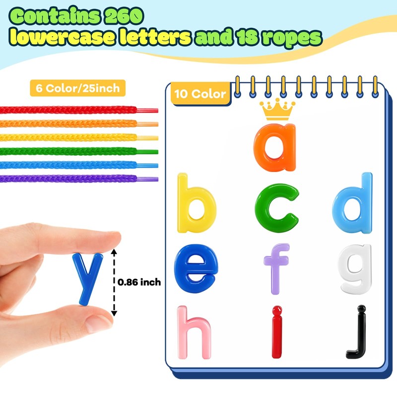 - Abundant Alphabet Learning Set - Includes 260 lowercase letter beads in 10 bright colors and 18 durable 25'' ropes—perfect for spelling, sorting, and word-building fun! Comes neatly packed in a clear storage bucket with a handle for easy organization and portability
