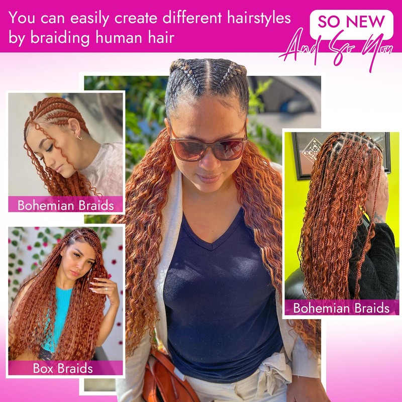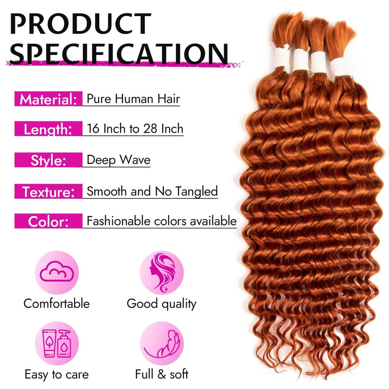 - 【Human Braiding Hair for Boho Braids’ Color】 Duzikai human braiding hair deep wave has a various of colors. Black braiding hair; Brown braiding hair; Burgundy red braiding hair; Ginger braiding hair; Blonde braiding hair and Ombre braiding hair. Choose your favorite color to make your beloved braidings.
