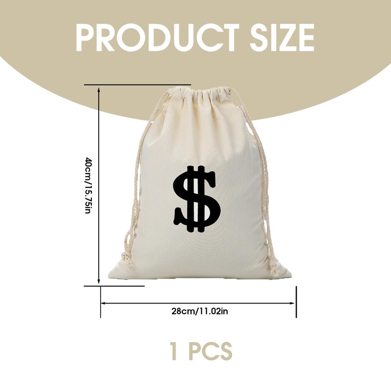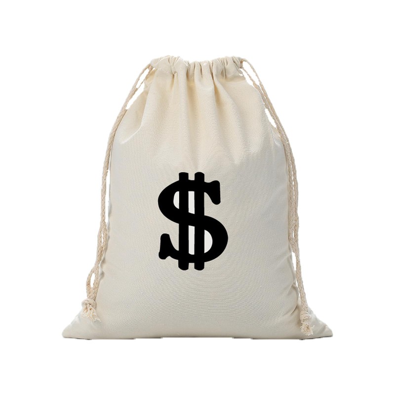 - HIGH QUALITY DOLLAR SIGN COTTON FABRIC BAG The money bag is made of durable cotton material that is soft to the touch while being durable. The size of 28 x 40 cm provides enough space for coins, sweets, small gifts