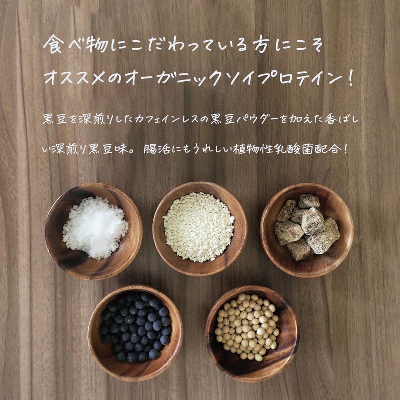 - 国産有機大豆を丸ごと微粉砕加工した国産有機JAS認証取得ソイプロテイン。深煎り黒豆入り。不足しがちなたんぱく質を効率良く補える、普段の食事にこだわっている方にこそオススメしたいプロテインです。