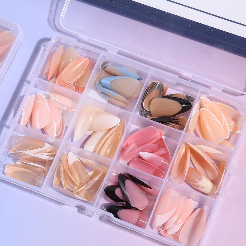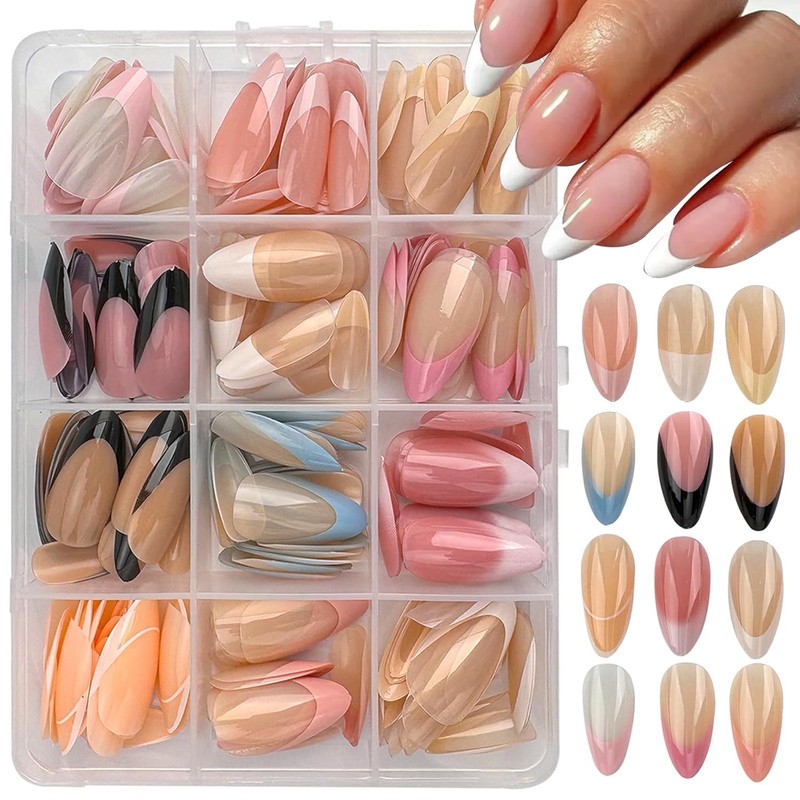 - Package Includes:You will receive 288 piece almond press on nails for women, which includes 12 different colors and size stored separately in box. 12 different sizes can allow you to choosen colorful french tip fake nail that better fit nails, give you a nice experience