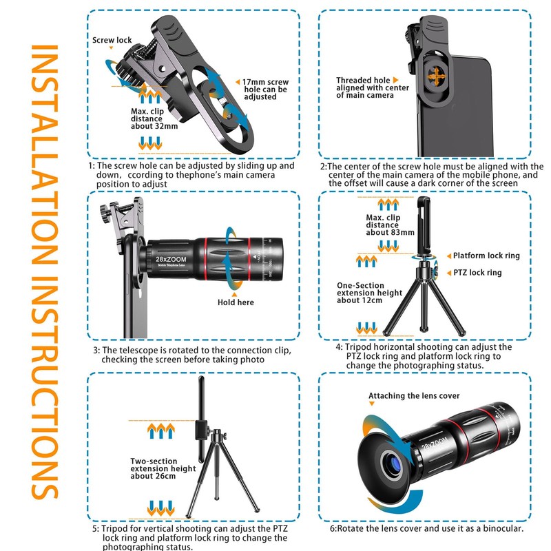 - Multiple Usage Modes: The high power 28x HD phone telephoto lenss is easy to install and has multiple shooting modes, including tripod shooting mode, telescope mode, and handheld shooting.