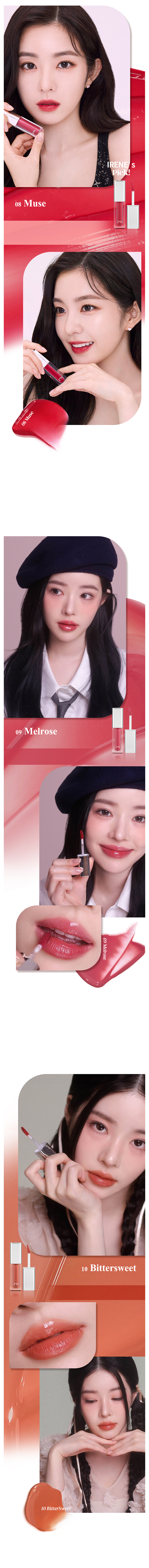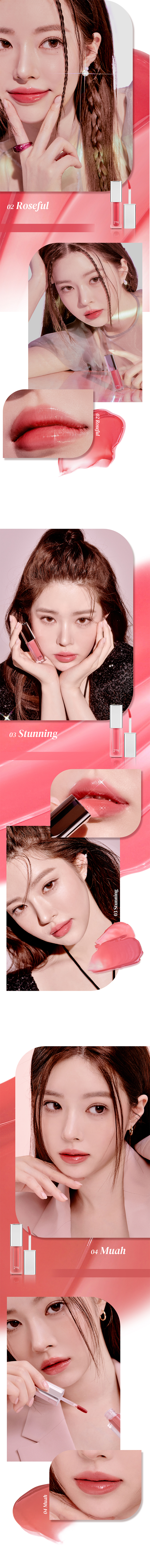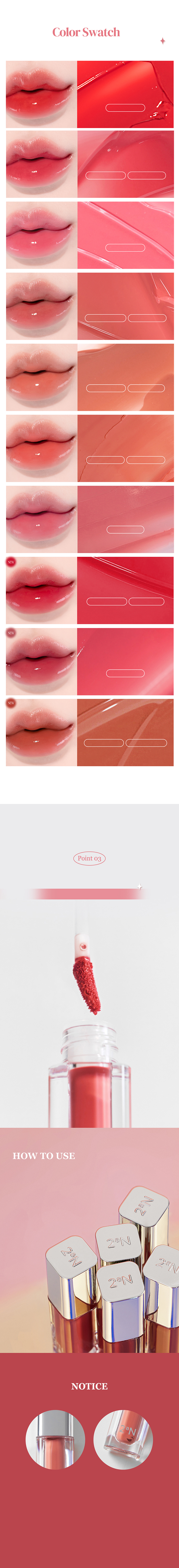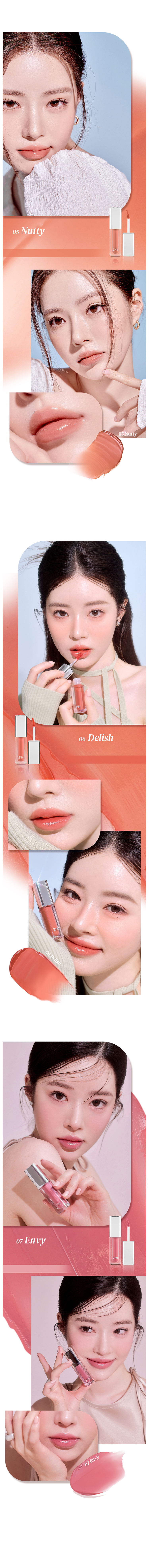 Provides clear and volumizing dewy texture. Clear and soft 10 dewy shades. Soft daily shades for your personal color. The product texture presents moisture glowing effect as if wave reflecting on sunshine, along with clear and dewy glow on lips. Complete with buildable moisturizing glow.
