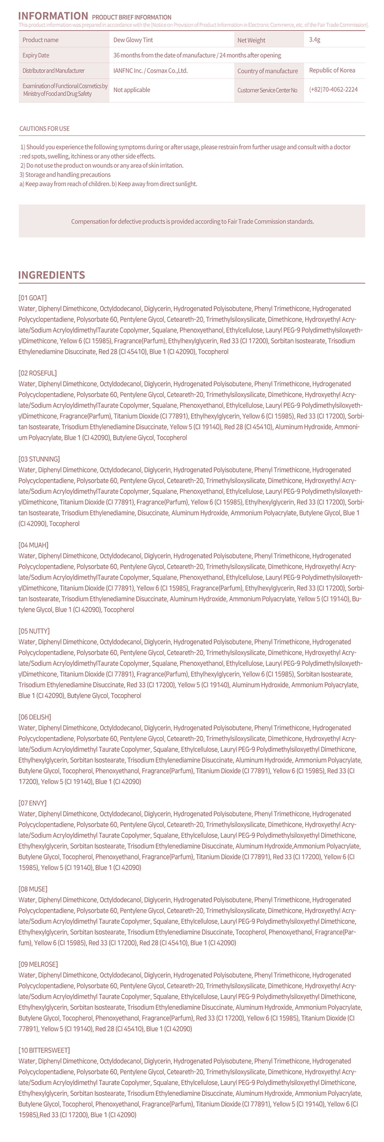 - Ingredients: 2aN Dew Glowy Tint #01 Goat Water, Diphenyl Dimethicone, Octyldodecanol, Diglycerin, Phenyl Trimethicone, Hydrogenated Polyisobutene, Hydrogenated Polycyclopentadiene, Polysorbate 60, Pentylene Glycol, Ceteareth-20, Trimethylsiloxysilicate, Dimethicone, Hydroxyethyl Acrylate/Sodium Acryloyldimethyl Taurate Copolymer, Squalane, Phenoxyethanol, Ethylcellulose, Lauryl PEG-9 Polydimethylsiloxyethyl Dimethicone, Sunset Yellow FCF, Fragrance, Ethylhexylglycerin, Fast Acid Magenta, Sorbitan Isostearate, Trisodium Ethylenediamine Disuccinate, Phloxine B, Brilliant Blue FCF, Tocopherol 2aN Dew Glowy Tint #02 Roseful Water, Diphenyl Dimethicone, Octyldodecanol, Diglycerin, Phenyl Trimethicone, Hydrogenated Polyisobutene, Hydrogenated Polycyclopentadiene, Polysorbate 60, Pentylene Glycol, Ceteareth-20, Trimethylsiloxysilicate, Dimethicone, Hydroxyethyl Acrylate/Sodium Acryloyldimethyl Taurate Copolymer, Squalane, Phenoxyethanol, Ethylcellulose, Lauryl PEG-9 Polydimethylsiloxyethyl Dimethicone, Fragrance, Titanium Dioxide, Ethylhexylglycerin, Sunset Yellow FCF, Fast Acid Magenta, Sorbitan Isostearate, Trisodium Ethylenediamine Disuccinate, Tartrazine, Phloxine B, Aluminum Hydroxide, Ammonium Polyacrylate, Brilliant Blue FCF, Butylene Glycol, Tocopherol 2aN Dew Glowy Tint #03 Stunning Water, Diphenyl Dimethicone, Octyldodecanol, Diglycerin, Phenyl Trimethicone, Hydrogenated Polyisobutene, Hydrogenated Polycyclopentadiene, Polysorbate 60, Pentylene Glycol, Ceteareth-20, Trimethylsiloxysilicate, Dimethicone, Hydroxyethyl Acrylate/Sodium Acryloyldimethyl Taurate Copolymer, Squalane, Phenoxyethanol, Ethylcellulose, Lauryl PEG-9 Polydimethylsiloxyethyl Dimethicone, Titanium Dioxide, Fragrance, Sunset Yellow FCF, Ethylhexylglycerin, Fast Acid Magenta, Sorbitan Isostearate, Trisodium Ethylenediamine Disuccinate, Aluminum Hydroxide, Ammonium Polyacrylate, Butylene Glycol, Brilliant Blue FCF, Tocopherol 2aN Dew Glowy Tint #04 Muah Water, Diphenyl Dimethicone, Octyldodecanol, Diglycerin, Phenyl Trimethicone, Hydrogenated Polyisobutene, Hydrogenated Polycyclopentadiene, Polysorbate 60, Pentylene Glycol, Ceteareth-20, Trimethylsiloxysilicate, Dimethicone, Hydroxyethyl Acrylate/Sodium Acryloyldimethyl Taurate Copolymer, Squalane, Phenoxyethanol, Ethylcellulose, Lauryl PEG-9 Polydimethylsiloxyethyl Dimethicone, Titanium Dioxide, Sunset Yellow FCF, Fragrance, Ethylhexylglycerin, Fast Acid Magenta, Sorbitan Isostearate, Trisodium Ethylenediamine Disuccinate, Aluminum Hydroxide, Ammonium Polyacrylate, Tartrazine, Butylene Glycol, Brilliant Blue FCF, Tocopherol 2aN Dew Glowy Tint #05 Nutty Water, Diphenyl Dimethicone, Octyldodecanol, Diglycerin, Phenyl Trimethicone, Hydrogenated Polyisobutene, Hydrogenated Polycyclopentadiene, Polysorbate 60, Pentylene Glycol, Ceteareth-20, Trimethylsiloxysilicate, Dimethicone, Hydroxyethyl Acrylate/Sodium Acryloyldimethyl Taurate Copolymer, Squalane, Phenoxyethanol, Ethylcellulose, Lauryl PEG-9 Polydimethylsiloxyethyl Dimethicone, Titanium Dioxide, Fragrance, Ethylhexylglycerin, Sunset Yellow FCF, Sorbitan Isostearate, Trisodium Ethylenediamine Disuccinate, Fast Acid Magenta, Tartrazine, Aluminum Hydroxide, Ammonium Polyacrylate, Brilliant Blue FCF, Butylene Glycol, Tocopherol 2aN Dew Glowy Tint #06 Delish Water, Diphenyl Dimethicone, Octyldodecanol, Diglycerin, Hydrogenated Polyisobutene, Phenyl Trimethicone, Hydrogenated Polycyclopentadiene, Polysorbate 60, Pentylene Glycol, Ceteareth-20, Trimethylsiloxysilicate, Dimethicone, Hydroxyethyl Acrylate/Sodium Acryloyldimethyl Taurate Copolymer, Squalane, Ethylcellulose, Lauryl PEG-9 Polydimethylsiloxyethyl Dimethicone, Ethylhexylglycerin, Sorbitan Isostearate, Trisodium Ethylenediamine Disuccinate, Aluminum Hydroxide, Ammonium Polyacrylate, Butylene Glycol, Tocopherol, Phenoxyethanol, Fragrance, Titanium Dioxide (CI 77891), Sunset Yellow FCF (CI 15985), Fast Acid Magenta (CI 17200), Tartrazine (CI 19140), Brilliant Blue FCF (CI 42090) 2aN Dew Glowy Tint #07 Envy Water, Diphenyl Dimethicone, Octyldodecanol, Diglycerin, Hydrogenated Polyisobutene, Phenyl Trimethicone, Hydrogenated Polycyclopentadiene, Polysorbate 60, Pentylene Glycol, Ceteareth-20, Trimethylsiloxysilicate, Dimethicone, Hydroxyethyl Acrylate/Sodium Acryloyldimethyl Taurate Copolymer, Squalane, Ethylcellulose, Lauryl PEG-9 Polydimethylsiloxyethyl Dimethicone, Ethylhexylglycerin, Sorbitan Isostearate, Trisodium Ethylenediamine Disuccinate, Aluminum Hydroxide, Ammonium Polyacrylate, Butylene Glycol, Tocopherol, Phenoxyethanol, Fragrance, Titanium Dioxide (CI 77891), Fast Acid Magenta (CI 17200), Sunset Yellow FCF (CI 15985), Tartrazine (CI 19140), Brilliant Blue FCF (CI 42090) 2aN Dew Glowy Tint #08 Muse Water, Diphenyl Dimethicone, Octyldodecanol, Diglycerin, Hydrogenated Polyisobutene, Phenyl Trimethicone, Hydrogenated Polycyclopentadiene, Polysorbate 60, Pentylene Glycol, Ceteareth-20, Trimethylsiloxysilicate, Dimethicone, Hydroxyethyl Acrylate/Sodium Acryloyldimethyl Taurate Copolymer, Squalane, Ethylcellulose, Lauryl PEG-9 Polydimethylsiloxyethyl Dimethicone, Ethylhexylglycerin, Sorbitan Isostearate, Trisodium Ethylenediamine Disuccinate, Tocopherol, Phenoxyethanol, Fragrance, Sunset Yellow FCF (CI 15985), Fast Acid Magenta (CI 17200), Phloxine B (CI 45410), Brilliant Blue FCF (CI 42090) 2aN Dew Glowy Tint #09 Melose Water, Diphenyl Dimethicone, Octyldodecanol, Diglycerin, Hydrogenated Polyisobutene, Phenyl Trimethicone, Hydrogenated Polycyclopentadiene, Polysorbate 60, Pentylene Glycol, Ceteareth-20, Trimethylsiloxysilicate, Dimethicone, Hydroxyethyl Acrylate/Sodium Acryloyldimethyl Taurate Copolymer, Squalane, Ethylcellulose, Lauryl PEG-9 Polydimethylsiloxyethyl Dimethicone, Ethylhexylglycerin, Sorbitan Isostearate, Trisodium Ethylenediamine Disuccinate,Aluminum Hydroxide, Ammonium Polyacrylate, Butylene Glycol, Tocopherol, Phenoxyethanol, Fragrance, Fast Acid Magenta (CI 17200), Sunset Yellow FCF (CI 15985), Titanium Dioxide (CI 77891), Tartrazine (CI 1