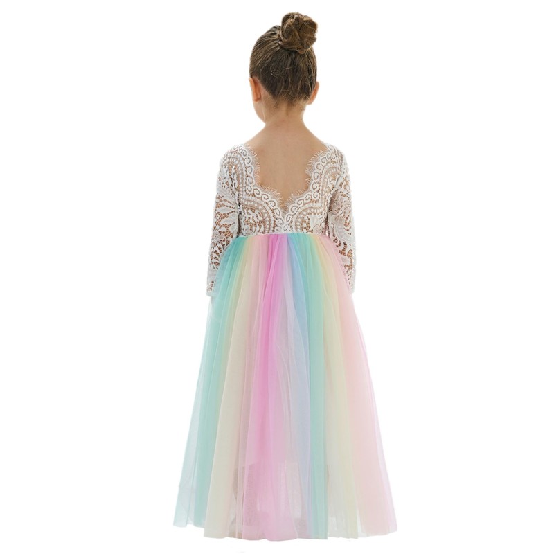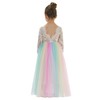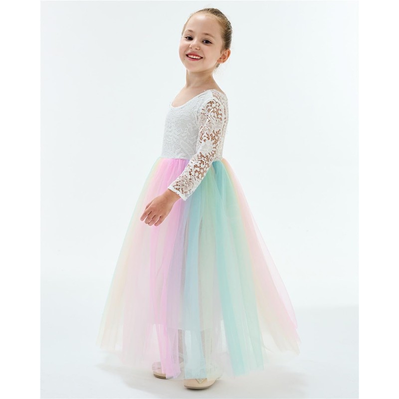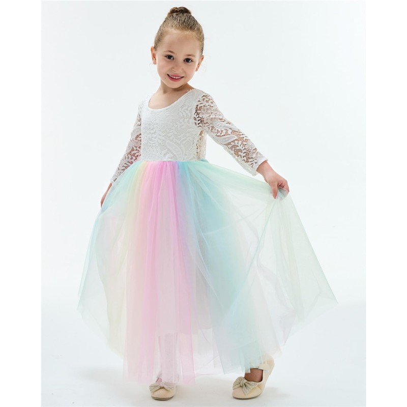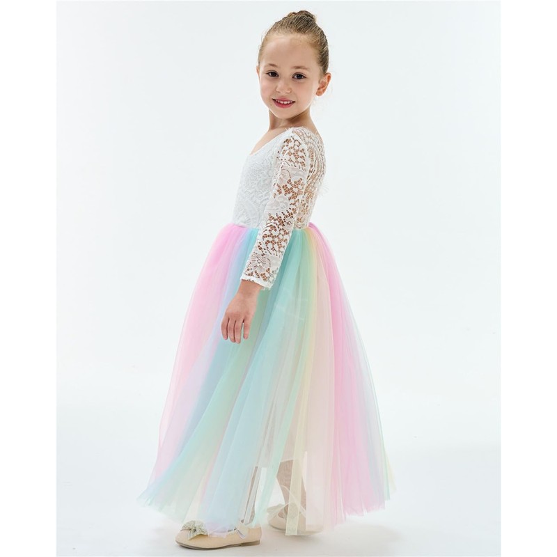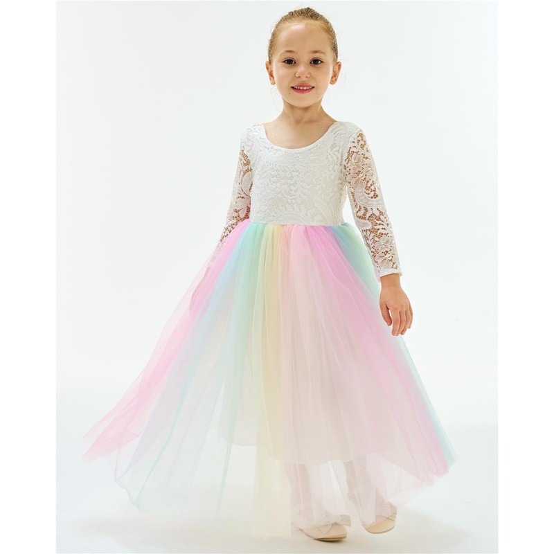 2Bunnies Girl Peony Lace Back A-Line Straight Tutu Tulle Party Flower Girl Dress (Pastel Rainbow Ombre Unicorn Sleeve Maxi, 4T)