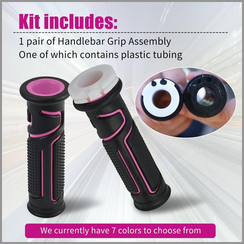 - Kit includes: 1 pair of Handlebar Grip Assembly, only one of which contains plastic tubing, we currently have 7 colors to choose from,