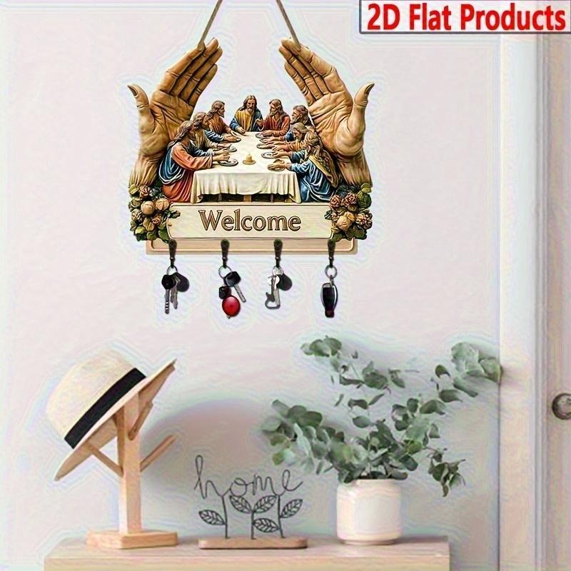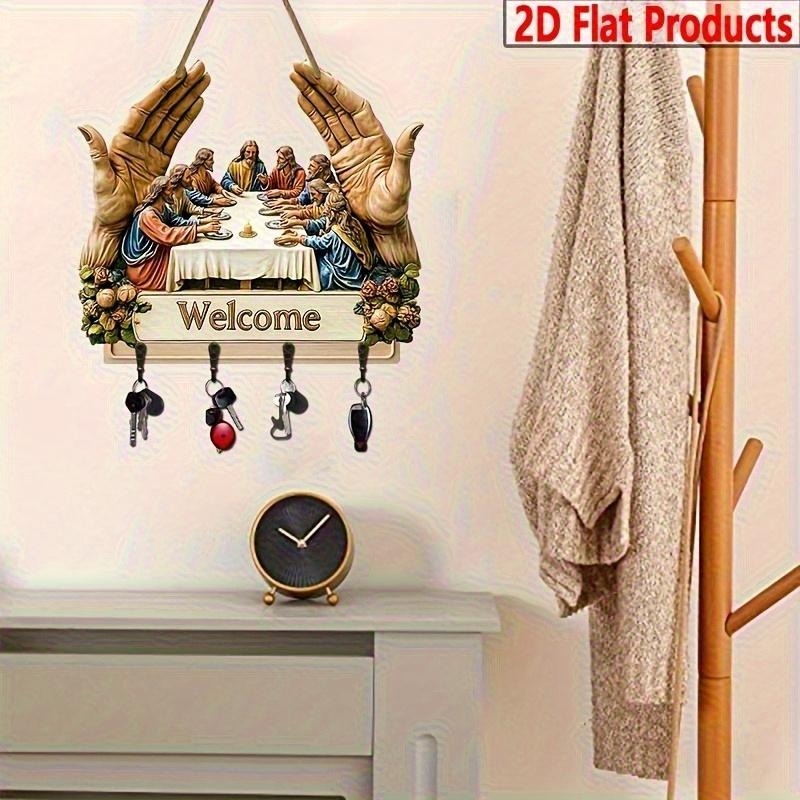 2D Flat Jesus and Disciples Wall Art Keychain Holder – Farmhouse Style Porch Welcome Sign with 4 Metal Hooks, 10.4" x 11.8" Artificial Wood & Metal Frame, Religious Home Décor