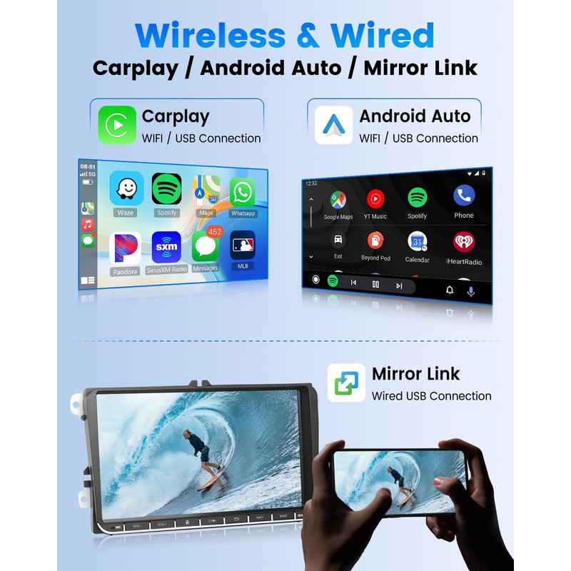 • 【Wireless Apple Carplay & Android Auto & Mirror Link】for VW Jetta Radio can choose wired or wireless carplay and Android Auto, connect to mobile phone, access mobile phone address book, mail, notification, map navigation, music, video and other information, and realize voice control. Support IOS/Android mirror link function, You can mirror the phone interface to car stereo.