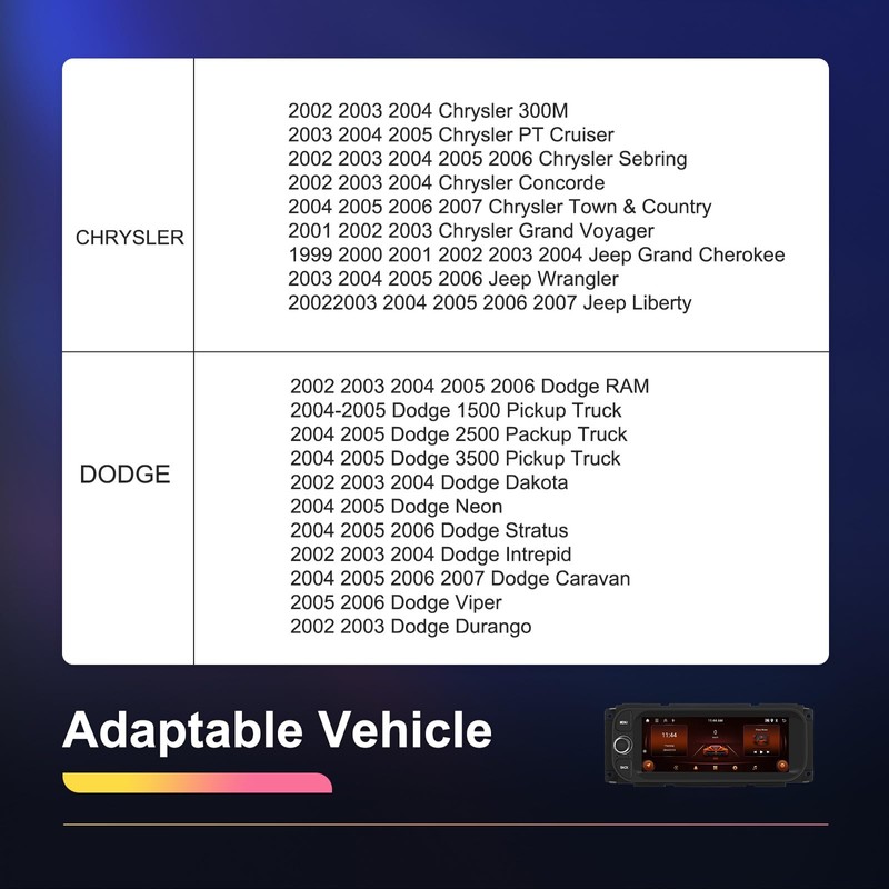 - 【Applicable Car Mode】 The in-dash GPS navigation head unit designed for Jeep Grand Cherokee 1999-2004,for Liberty 2002-2007, for Wrangler 2003-2006; For Chrysler 300M 2002-2004, for Chrysler PT Cruiser 2003-2005, for Sebring Sedan 2002-2006, for Chrysler Coincide 2002-2004, for Chrysler Town&Country 2004-2007, for Chrysler Grand Voyager 2001-2003; For Dodge RAM 2002-2006, for Dodge 1500/2500/3500 Pickup 2004-2005