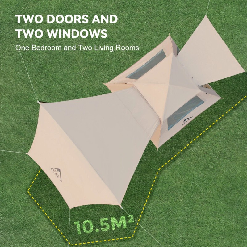 Supported by robust fiberglass poles, the tent is designed to withstand harsh weather conditions, offering durability and strength.