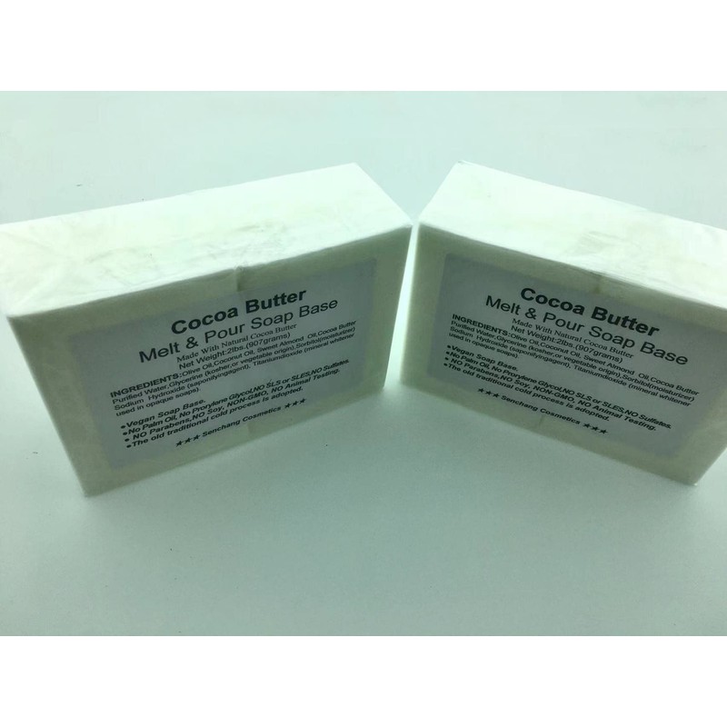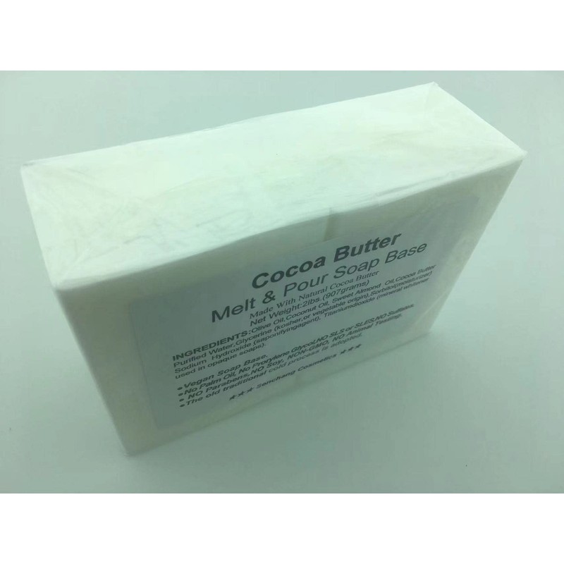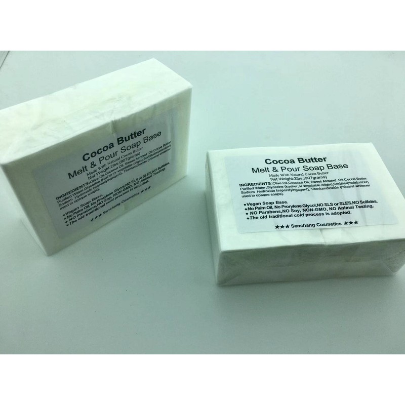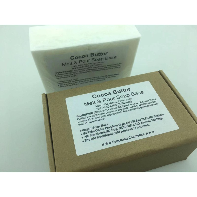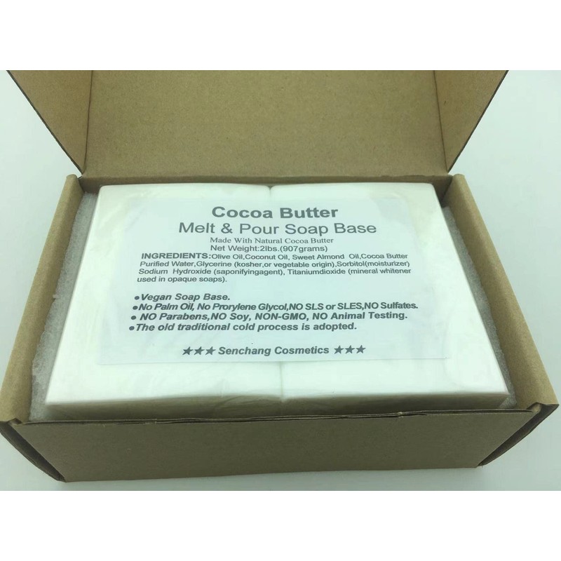- *Senchang Cosmetics* Cocoa Butter Melt and Pour Soap Base is made of virgin olive oil, refined coconut oil, sweet almond oil, and other vegetable oils by the ancient cold saponification method, and add Natural Cocoa butter. It is a pure vegetarian soap base and does not contain various surfactants.