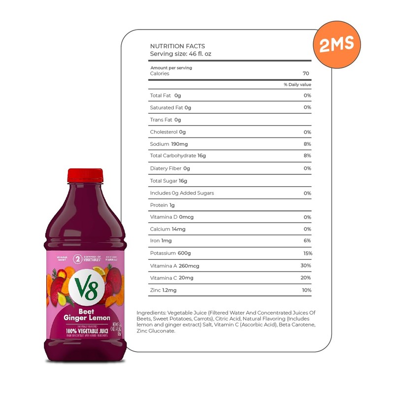 2MS Box with V8 Blend Jucie 46 Fl oz 6 Count Beet Ginger Lemon