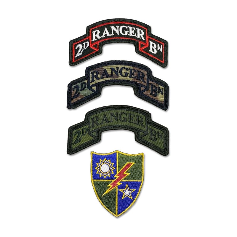| 2nd Ranger BN Scroll grouping - 3 scrolls and a 75th unit insignia - Hook & Loop OD GREEN, DRESS, and MULTI-CAM SCROLLS all four pieces Velcro Backed (Hook & Loop) Modern US 2nd Ranger Battalion Scroll - 3 7/8" x 2" Merrowed - JBLM - Fort Lewis, WA |