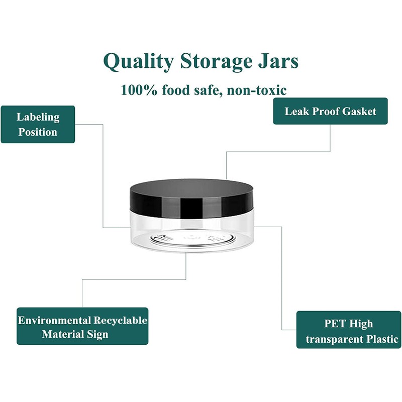 - LEAK PROOF: Cosmetic jars have thread and gasket seals on the lids, and possessing good airtightness can effectively prevent leakage and prevent the moisture in the clear jars from contacting the air. So feel free to put these round jars in your backpack or makeup bag without worrying about them leaking.
