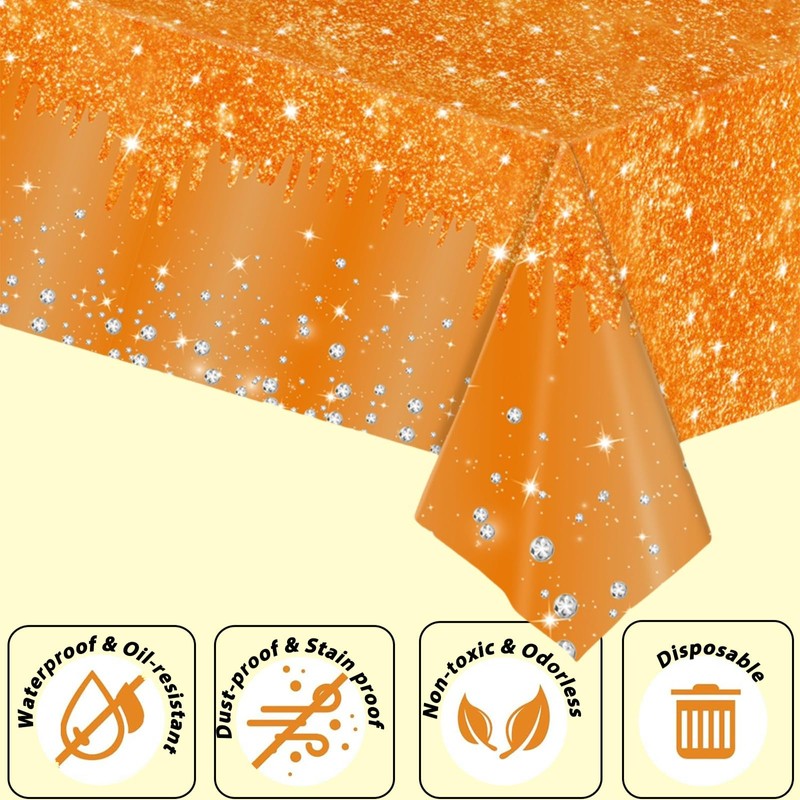 2P Orange Party Plastic Table Cloth,137x274cm Shiny Glitter Orange Tablecloths Rectangular Diamond Gold Party Dining Tablecover Orange Tablecloth Thanksgiving Birthday Autumnal Party Orange Tablecloth