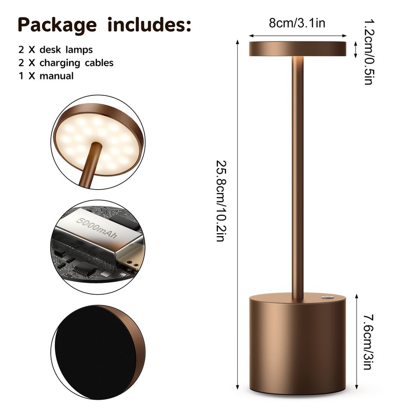 2Pack Cordless Table Lamp, Rechargeable Battery 5000mAh Metal Aluminum Housing USB LED Portable Powered Desk Lamp, 3 Levels Brightness Night Light for Restaurants Bars Outdoor (2 pack-10.25in-Coffee)