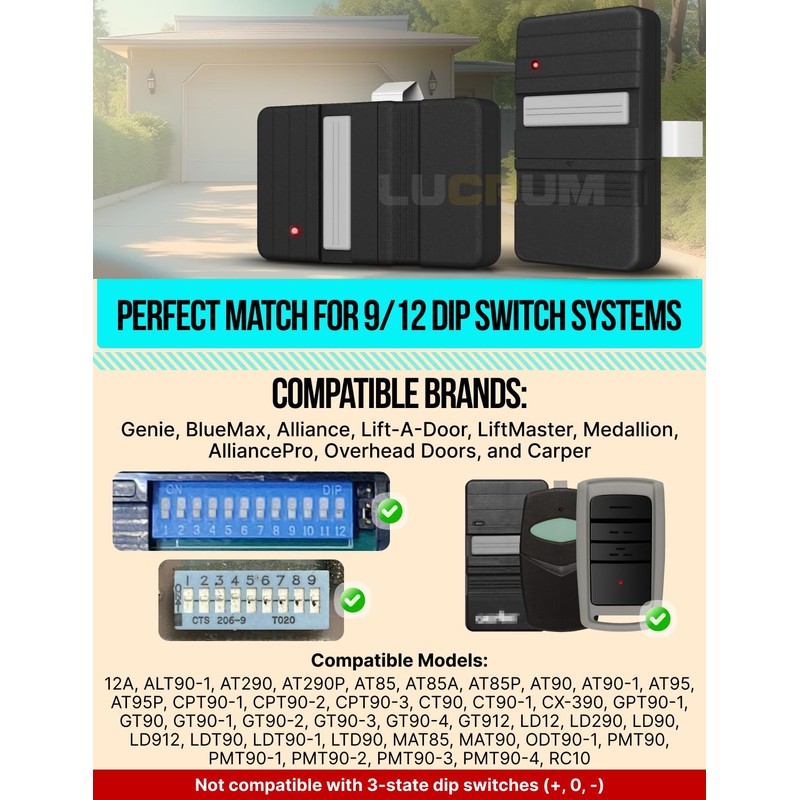 - Wide Compatibility: Works with Genie & Overhead Door models using 9 or 12 dip switches, including GT90-1, AT90-1, and more. Easily replaces your garage remote, providing secure access to your garage with just a click