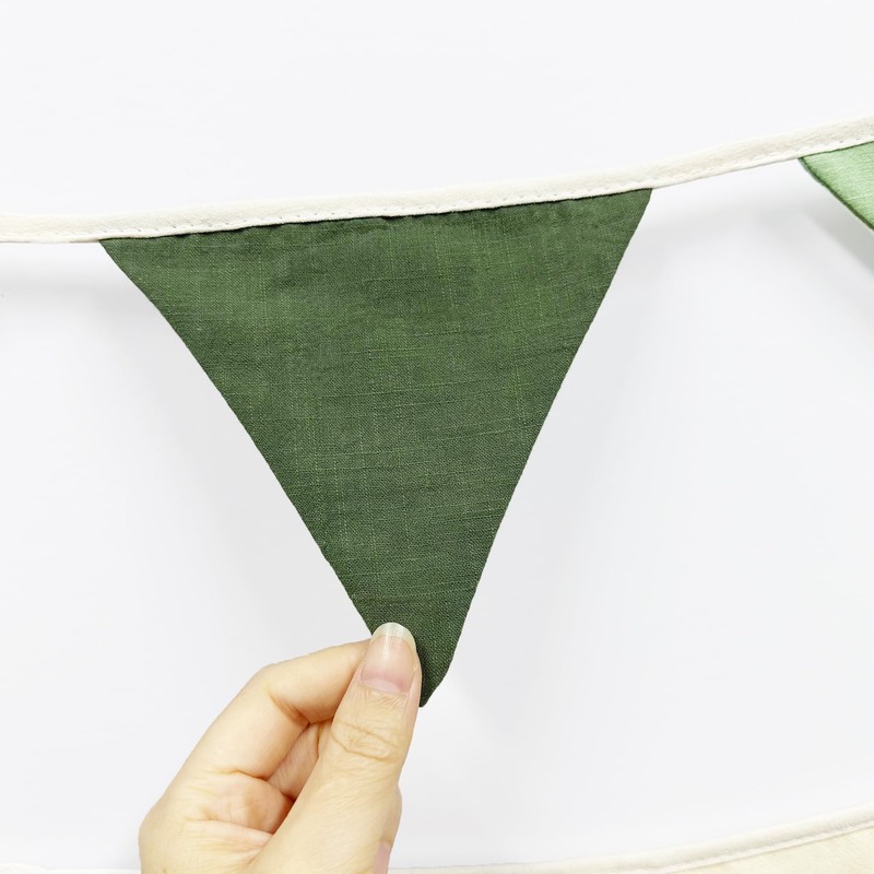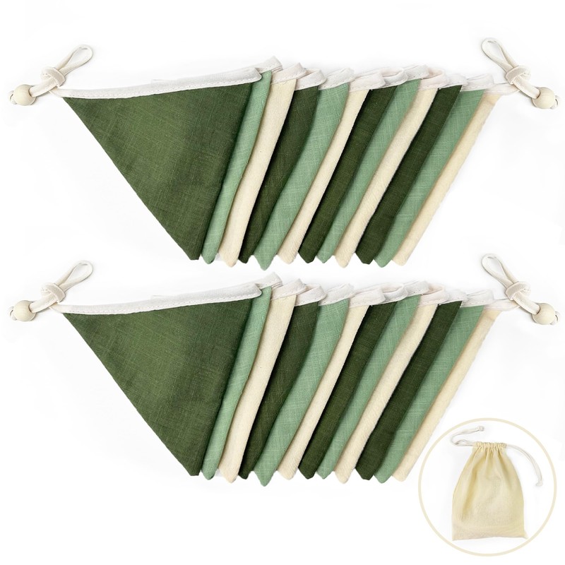 - PACKAGE CONTAINS: 2 pack double layer green linen fabric banner garland in olive green, sage green and cream colors, 12pcs flags in 8.2ft/2.5meters each, total is 5M/16.4Feet. Flag side length: 6.3in.Each string has two small wooden beads strung at the end.