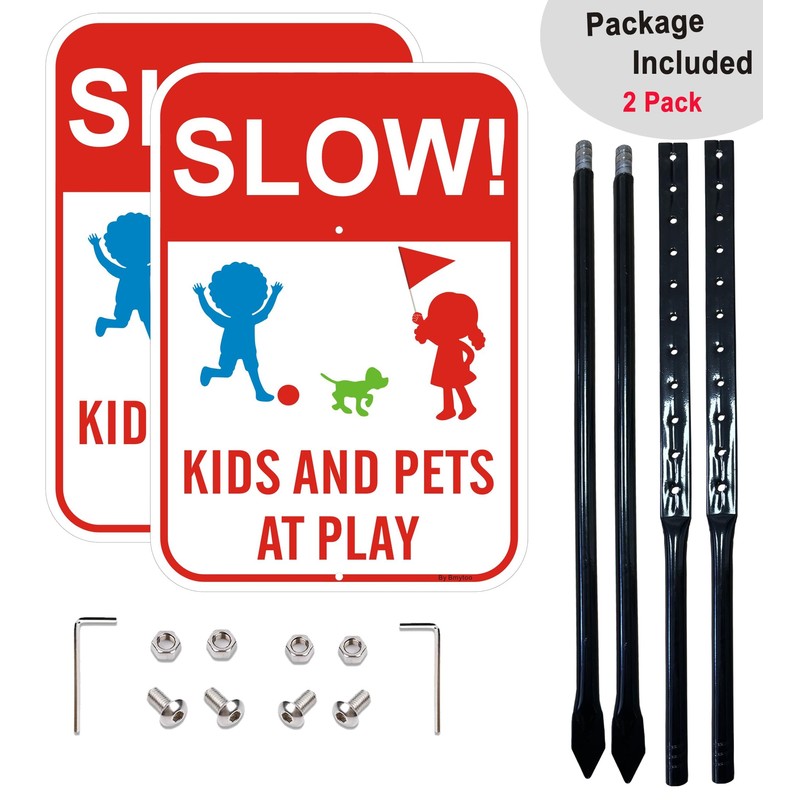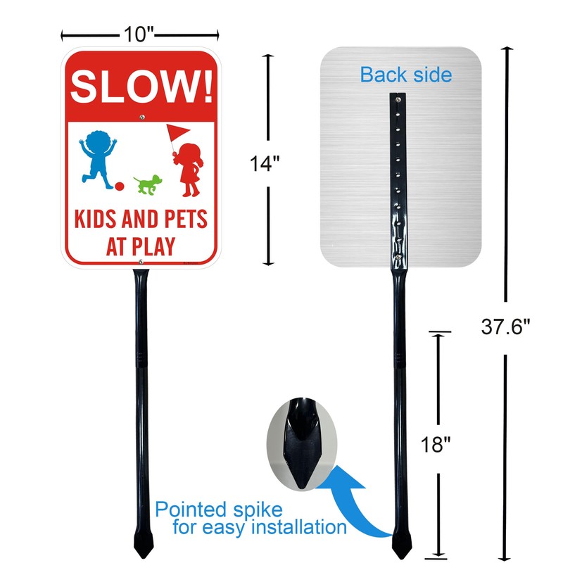 - Easy Installation: Each Slow Kids and Pets at Play Sign comes with a 36" metal thick stake and Screws Bag for easy installation and secure mounting in the ground