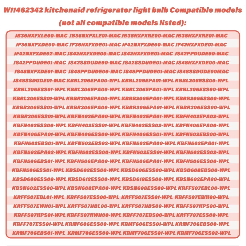 - Led light w11462342 Compatible models: KBSN608EPA00-WPL,KBSN608ESS00-WPL,KRFF507EBL00-WPL, KRFF507EBL01-WPL,KRFF507ESS00-WPL,KRFF507ESS01-WPL, KRFF507EWH00-WPL,KRFF507EWH01-WPL,KRFF507HBL00-WPL, KRFF507HBS00-WPL,KRFF507HPS00-WPL,KRFF507HPS01-WPL, KRFF507HWH00-WPL,KRFF707EBS00-WPL,KRFF707ESS00-WPL, KRFF707ESS01-WPL,KRMF606ESS00-WPL,KRMF606ESS01-WPL, KRMF706EBS00-WPL,KRMF706EBS01-WPL,KRMF706ESS00-WPL, KRMF706ESS01-WPL,KRMF706ESS02-WPL