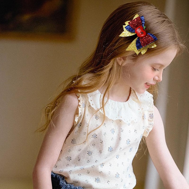 - Vibrant Back to School Hair Bows: 2pc glitter hair bow clips feature a sparkly yellow, red, and blue design, cute resin red apple accented,perfect for adding a pop of color to your child’s school uniform or casual outfit.