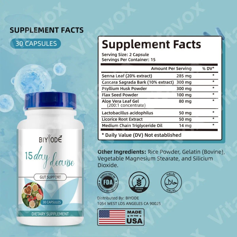 ¡Descubre la salud y el bienestar con Vitavox 15 Day Cleanse, el complemento alimenticio que transformará tu salud intestinal! Este potente detox de 15 días está diseñado para limpiar y desintoxicar tu intestino y colon de manera efectiva, ayudándote a eliminar residuos y toxinas acumuladas en solo dos semanas.