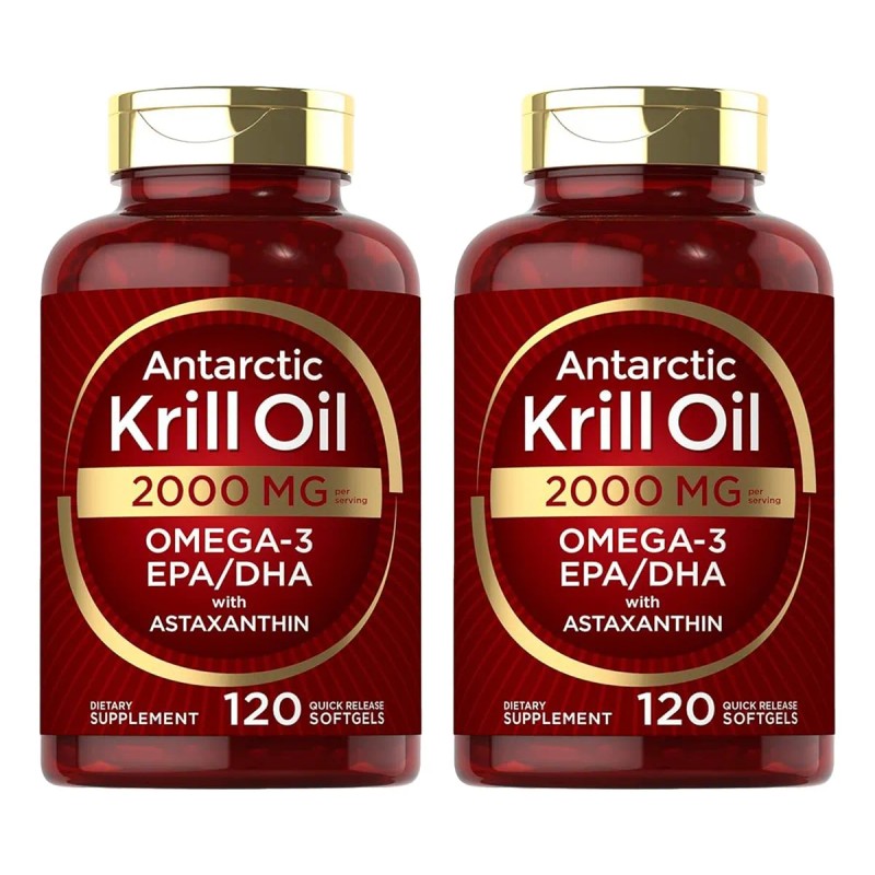 2 Pack Krill Oil 2000 mg – 120 cápsulas cada uno 🦐💧 | Fuente premium de omega-3 (DHA/EPA) en fosfolípidos de krill antártico. Soporta salud cardiovascular, función cerebral y articulaciones. ✅ ¡Bienestar total en dos frascos!