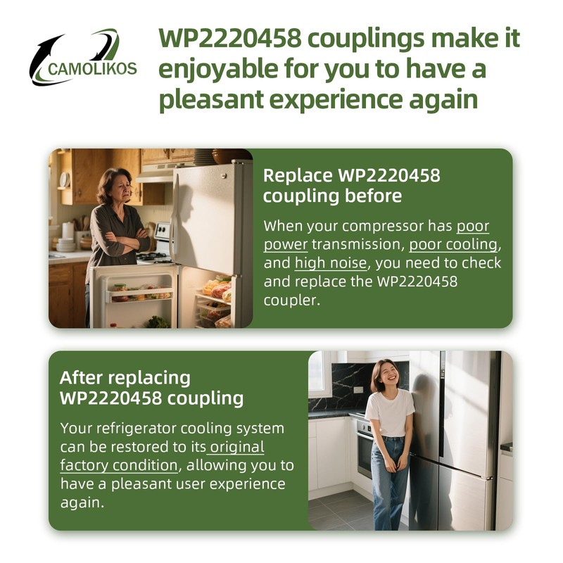 - When the power transmission effect of your compressor is poor, the cooling effect is not good, and the noise is loud, it is necessary to check and replace the wp2220458 coupler. After replacement, your refrigerator cooling system can be restored to its original factory state, allowing you to have a pleasant user experience again.