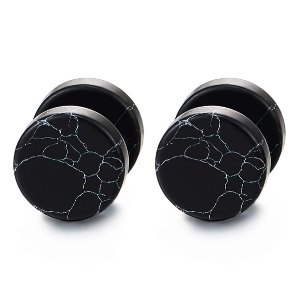 2pcs 10MM Black Marble Stud Earrings Men Women, Steel Cheater Fake Ear Plugs Gauges Illusion Tunnel