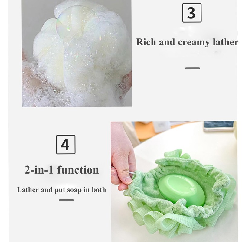 • [Soft and Gentle] Crafted from soft material,these bath gloves are gentle on the skin, ensuring a soothing and relaxing bathing experience.2-in-1 Loofah and Washcloth offer a deep and satisfying clean.Simply place the soap in the bath towel and gently pull the rope to wrap the soap for easy bathing.