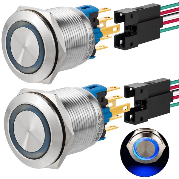 2Pcs 22mm Latching Push Button Switch 12VDC On Off Waterproof IP67 Stainless Steel with LED 7/8" with Wire (Blue, Latching,12V)