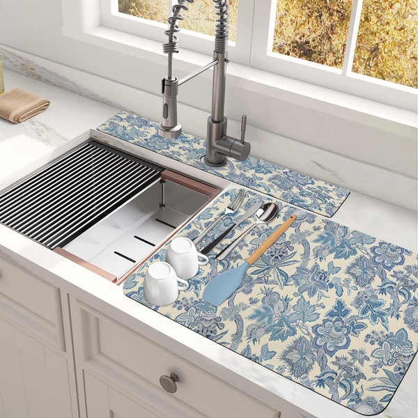 2PCS 23.5" x 15.5" Dish Drying Mat & 24" x 5.5" Sink Splash Guard, Ultra Absorbent & Cuttable Flower Dish Mat Drying Kitchen Mat with Non-slip Rubber Backed, Hide Stain Drying Matt Kitchen Counter