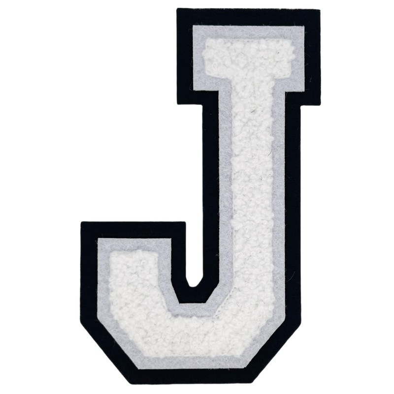 2Pcs 5.0" White Chenille Letter Patches, Iron On Embroidered Alphabet Patches for Clothing, Jeans, Jackets, Backpacks, Hats- Varsity Letters with Black Border (Letter J)