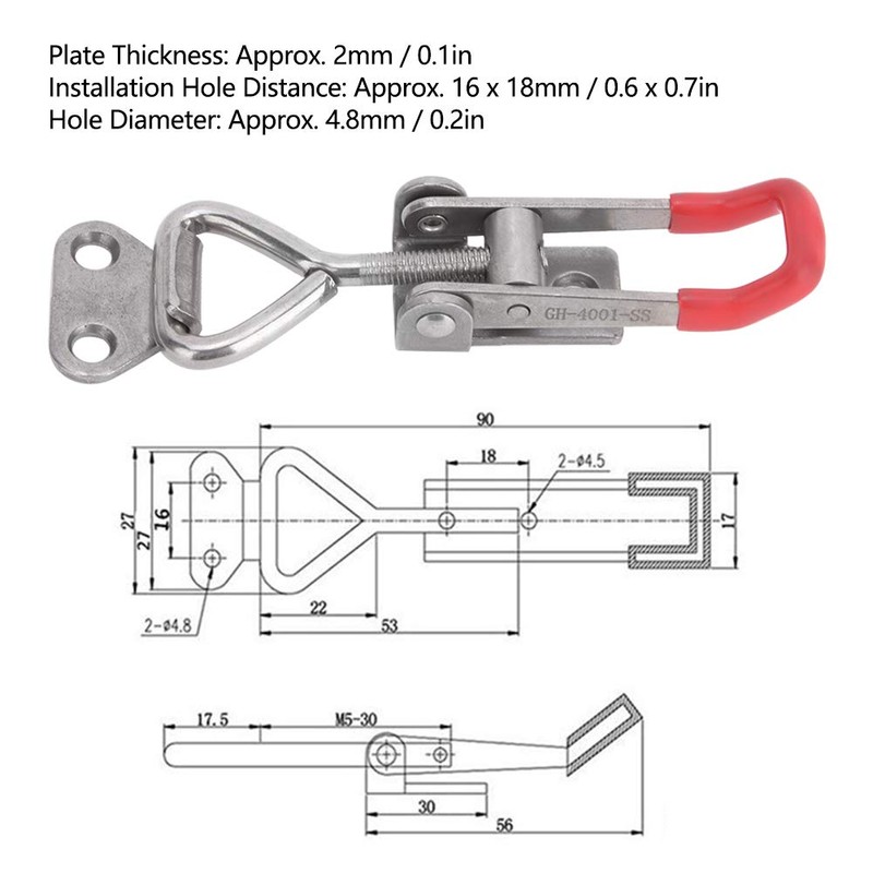 - Adjustable Toggle Clamp Clip : The installation hole distance is 16x18mm, simple to install and remove, Made of 304 stainless steel material, wear-resistant and long service life, The thickness of plate is 2.0mm, stable and to use