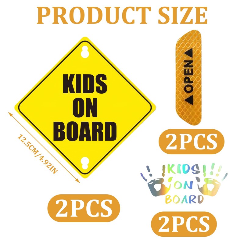 • ⚠️Use with:You will receive 2 child on board car sign, 1 each in yellow and black, with a size of 12.5 cm, 2 baby warning reflective car stickers (laser G148A3) and 4 door reflective stickers (open single sheet-yellow). This kids on board car sticker uses high-quality waterproof materials and can remain intact even in rainy or bad weather.