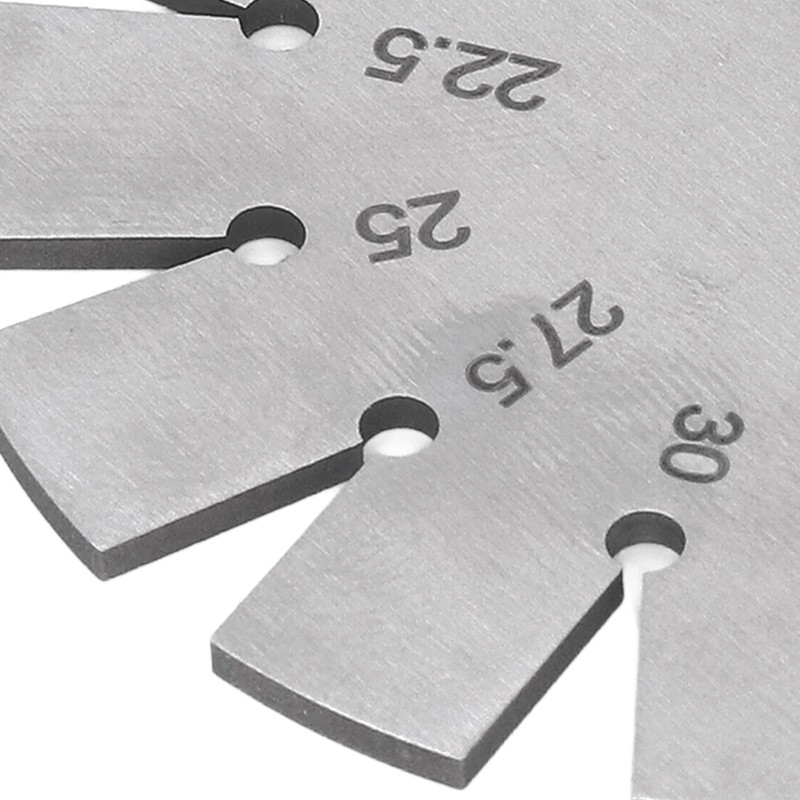 - VERSATILE: This angle gauge can measure 12 common angles, including 15°, 17.5°, 20°, 22.5°, 25°, 27.5°, 30°, .5°, 35°, 45°, 60°, and 120°, making it suitable for a wide range of applications.