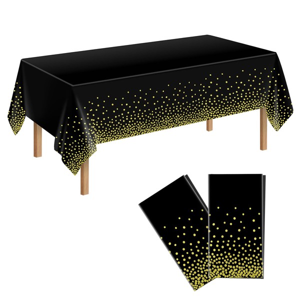 2Pcs Black Gold Dot Plastic Disposable Tablecloths, 137 x 274cm Plastic Rectangle Table Covers for Party