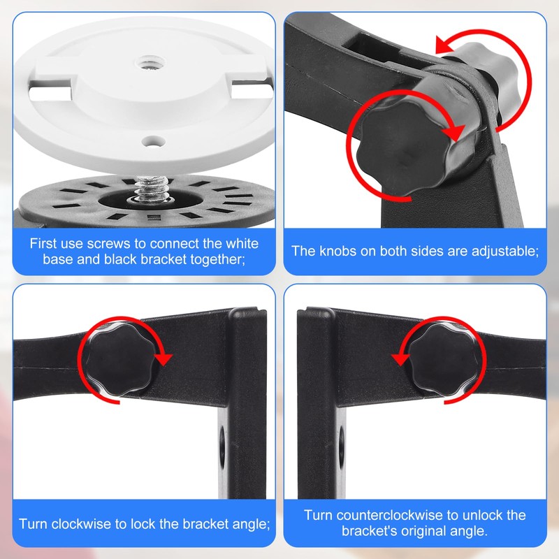 • Special Design: First, use the screws to assemble the white base and black bracket after receiving. And the white knobs on each side is adjustable. Simply turn them clockwise to fix the angle of the mount, or counterclockwise to return it to its original position. You can adjust it according to your needs.