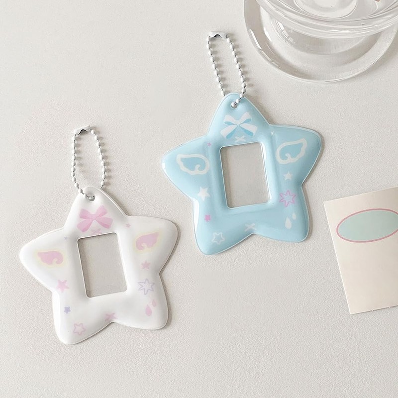 2pcs Cartoon Star Photocard Holder,1 inch ID Badge Holders Bule White Mini ID Card Holder Keychain Photocard Holders Cute Bow Star Photo Keychain Card Protector for Student Portrait Photo Cards